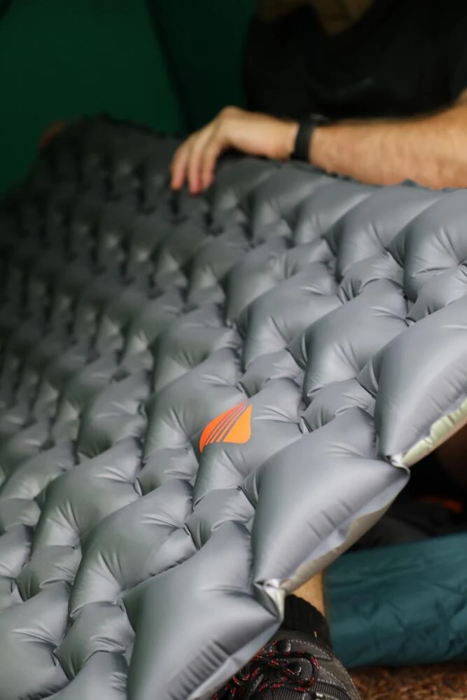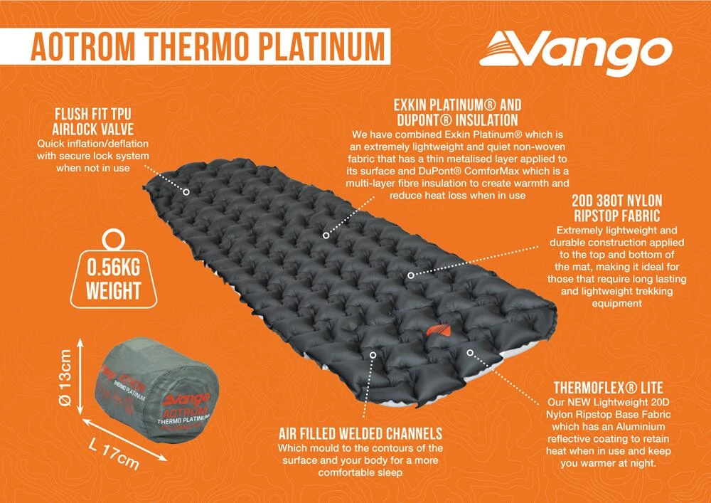 How do you improve on our lightest range of sleep mats? You add more warmth of course! The Aotrom Thermo Platinum upgrades the Aotrom Thermo sleep mat with a new Exkin Platinum base fabric. Exkin Platinum is a lightweight, non-woven fabric that features a metalised layer that more efficiently reflects heat back to your body to retain more warmth. We also swap out the siliconised hollow fibre insulated core with a premium DuPont insulation that helps retain heat for longer in its unique material design. Our unique Air Filled Welded Channels found only on the Aotrom range mould to the contours of your body for a more comfortable sleep whether you’re a back or side sleeper. And most importantly we’ve keep the ultralight design making it ideal for bikepacking and lightweight adventures.