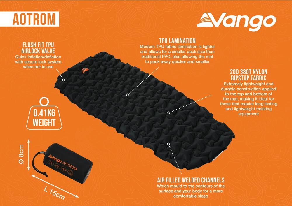 One of our lightest sleeping mat at just 410g, the Aotrom trek sleeping mat is one of the most technical and advanced sleeping mats in our range. It is the ultimate in lightweight with a small pack, packing down to around the size of a can of juice, whilst not compromising on comfort. Its air filled Welded Channels mould to the contours of the ground and your body for a more comfortable sleep.