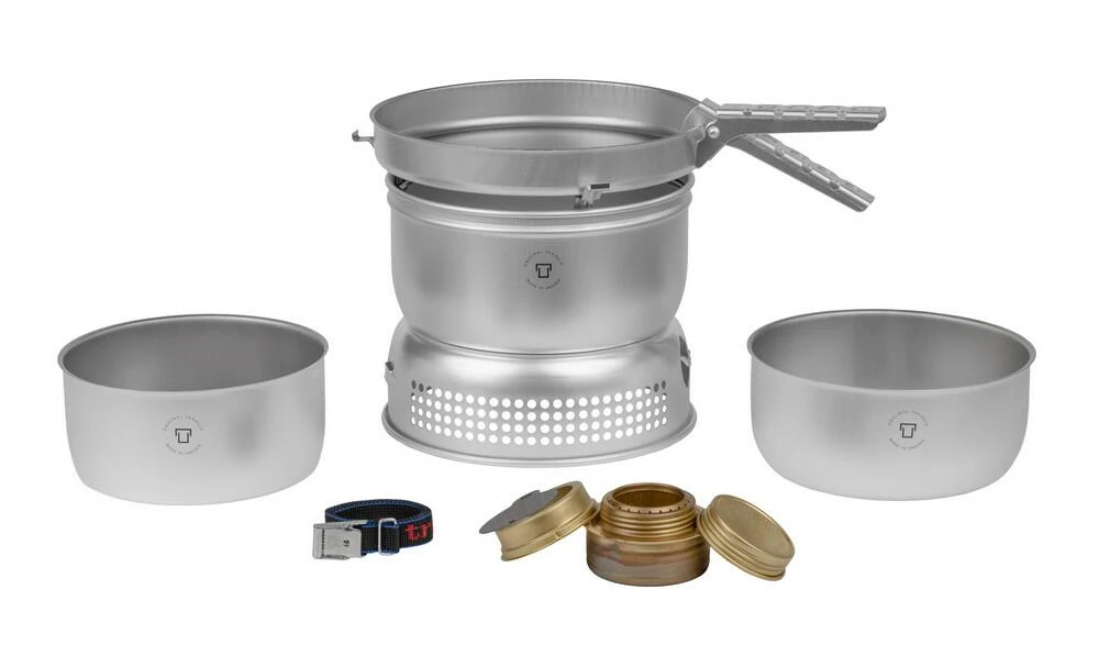 Duossal 2.0. Trangia’s unique super laminate! Stainless steel on the inside and aluminium on the outside. Complete with the Trangia Spirit Burner. Trangia 25 series is our larger stove, perfect for 3-4 people. All our stoves in series 25 include two saucepans sized 1.75 and 1.5 litres, a frying pan, a windshield (upper and lower part), burner, handle and strap.
